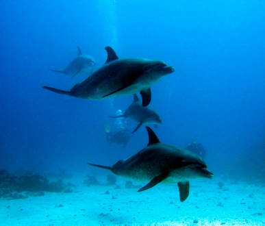 Der restliche Urlaub verlief geschmeidig, bis auf unseren 2ten Tauchgang, bei dem mein Buddy leider einen Schuss ins Hirn bekam und an Abtauchen nicht zu denken war. So schloss ich mich einer anderen 2er Gruppe an und nach 20 Minuten kamen die 4 Delfine auf uns zu. Also im Prinzip haben sie mich fast über den Haufen geschwommen. Was man ja auf einem Bild erkennen kann - ich war in greifbarer Nähe. Mein Buddy hat sich geärgert, doch zum Glück hatte ich darauf bestanden seine Kamera mitzunehmen. Juchu!